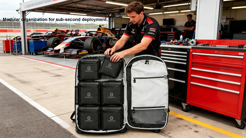 Pain Point: Small parts (sensors, specialized wrenches, telemetry units) are often lost or damaged in "giant sack" style bags, costing precious seconds during critical pit stops.