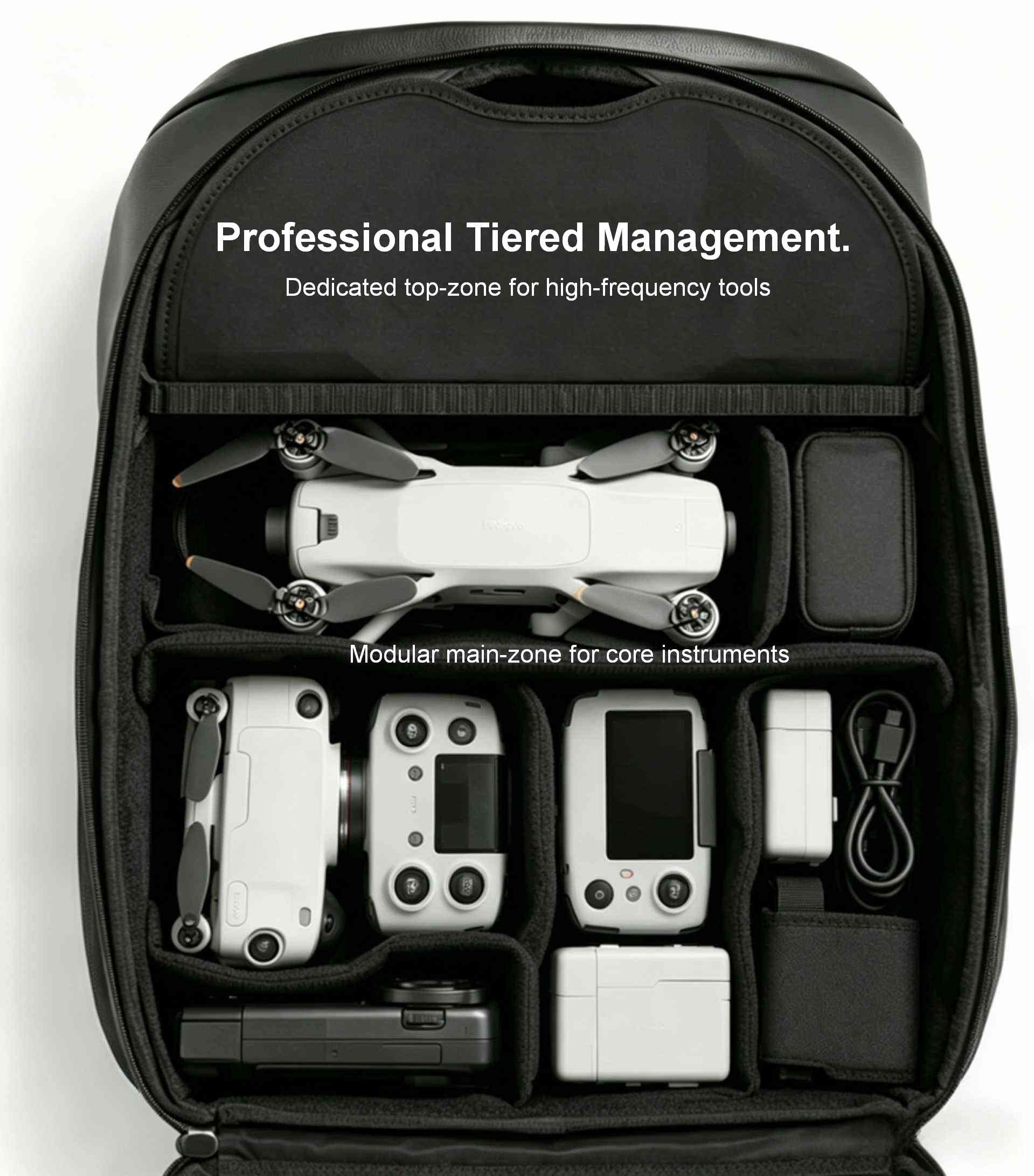 Independent Top-Zone: A dedicated hard-shell compartment for high-frequency items (GPS, antennas, spare props).